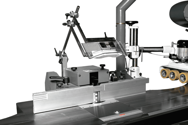 The patented spindle moulder fence is equipped with 2 levers locking and unlocking it quickly by a 90° rotation, while the removing and quick positioning of the table fence takes place with motorized rotation and lifting. The positions are checked by special sensors.